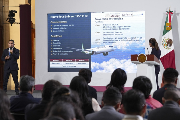 El director general de Mexicana de Aviación, Leobardo Ávila, anunció que a partir del 25 de agosto realizará el primer vuelo comercial del avión Embraer E195-E2 que recibió la presidenta Sheinbaum el pasado 1° de julio. La aeronave recorrerá la ruta AIFA-Tulum-AIFA.