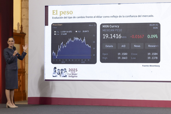 CIUDAD DE MÉXICO.- La Presidenta Claudia Sheinbaum Pardo resaltó que, gracias a que la Cuarta Transformación hace un manejo responsable de la economía, hay confianza en nuestro país la cual se refleja en la evolución del peso mexicano, que hoy cerró su tipo de cambio en 19.14 pesos por dólar; en la disminución de la tasa de interés a 10 años, en la reducción de la percepción internacional sobre la probabilidad de impago y en que, de acuerdo con el Banco Mundial, 11 millones de mexicanos salieron de la pobreza.