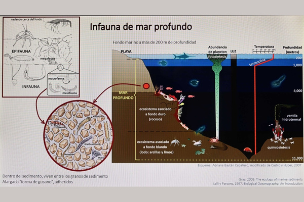 Escobar Briones dijo con respecto al mar profundo que, pese a la ausencia de luz, alta presión y baja temperatura, el cambio climático también tendrá efectos sobre la biodiversidad, especies únicas, varias de ellas longevas, y los procesos que se desarrollan en este extenso ecosistema que ocupa 95 por ciento del espacio marino.