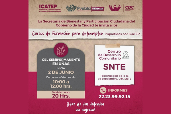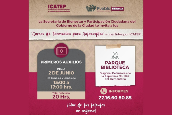 CIUDAD DE PUEBLA.- El Gobierno de la Ciudad, encabezado por el alcalde Pepe Chedraui Budib, a través de la Secretaría de Bienestar y Participación Ciudadana, invita a la ciudadanía a inscribirse en los cursos gratuitos de capacitación que se imparten en coordinación con el Instituto de Capacitación para el Trabajo del Estado de Puebla (ICATEP). Esta iniciativa forma parte de una estrategia integral para fortalecer el tejido social, impulsar el desarrollo comunitario y apoyar la economía familiar.