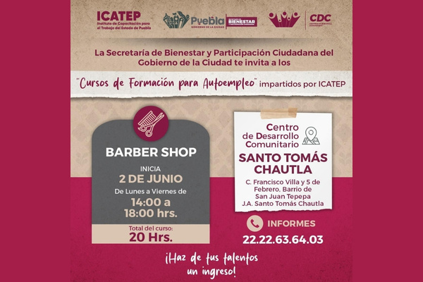 Las capacitaciones darán inicio el próximo 2 de junio. El curso de Primeros Auxilios se impartirá en el Parque Biblioteca. El taller de Gel Semipermanente en uñas tendrá lugar en el Centro de Desarrollo Comunitario SNTE. Por su parte, el curso de Barber Shop se ofrecerá en el Centro de Desarrollo Comunitario de Santo Tomás Chautla. Finalmente, el curso de Aplicación de Pestañas, con técnicas japonesa y hawaiana, se impartirá en el Centro de Desarrollo Comunitario de San Ramón.