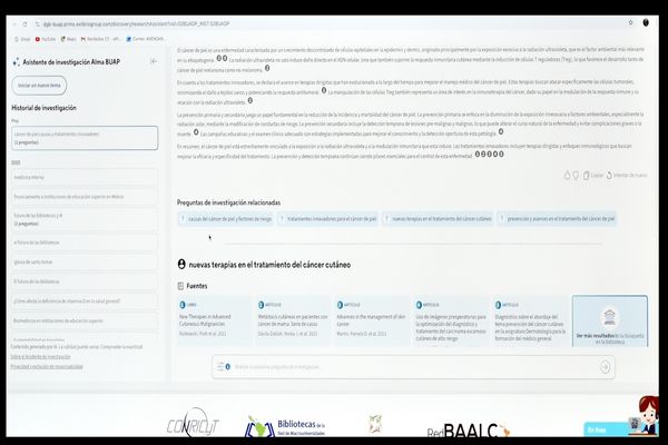 El Asistente de Investigación permite a los usuarios acceder a más de 500,000 libros en versión completa y a 165 plataformas de investigación digital, consolidando la información en un solo protocolo de búsqueda intuitivo y fácil de usar. Este sistema no solo busca dentro de las plataformas de investigación en línea de la BUAP, sino que también explora la web en general, ofreciendo una experiencia de búsqueda más completa y asertiva.