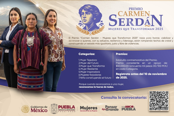 Es importante mencionar que las interesadas en participar en el Premio “Carmen Serdán, Mujeres que Transforman 2025”, pueden enviar sus postulaciones al correo secretaria.mujeres@puebla.gob.mx a más tardar el 10 de noviembre de 2025. La convocatoria completa puede consultarse en el sitio oficial: sm.puebla.gob.mx.