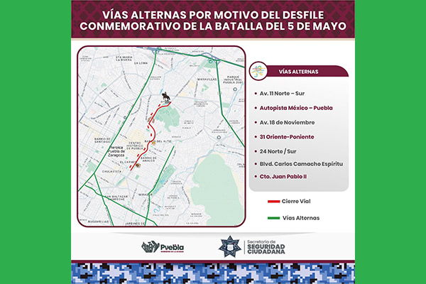 La Secretaría de Seguridad Ciudadana (SSC) informa que, el lunes 05 de mayo del año en curso, la Dirección General de Control de Tránsito, implementará vías alternas debido a los cierres viales por el Desfile Conmemorativo de la Batalla del 5 de Mayo, a partir de las 06:00 hasta las 16:30 horas, mismo que se realizará en las principales calles de la capital poblana.