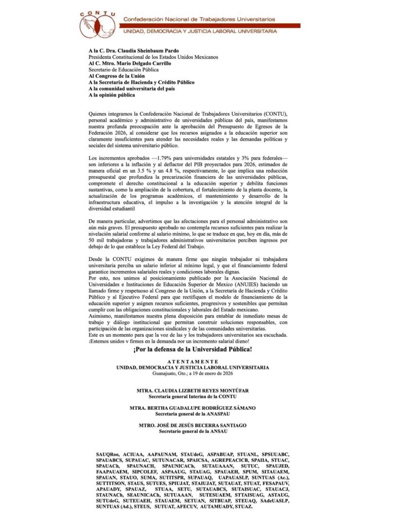 GUANAJUATO, GTO.- La Confederación Nacional de Trabajadores Universitarios (CONTU) expresa su profunda preocupación ante la aprobación del Presupuesto de Egresos de la Federación 2026 (PEF), dado que los recursos asignados a la educación superior resultan insuficientes para satisfacer las necesidades reales y demandas del sistema universitario público.