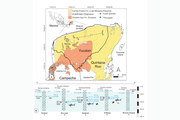 “A partir del registro fósil encontrado en las rocas de la Formación Carrillo Puerto podemos identificar los diferentes grupos de animales que estaban viviendo en la península de Yucatán, en lo que actualmente son los cenotes. Lo que ahora es un sistema de cuevas inundadas, anteriormente era un mar poco profundo”, señaló.