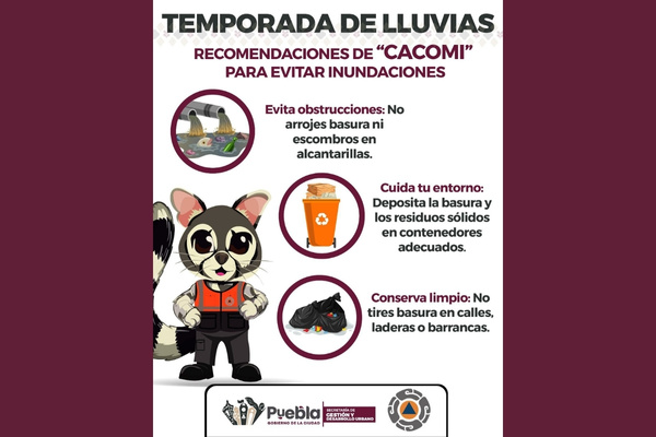 CIUDAD DE PUEBLA.- Con el objetivo de proteger a la ciudadanía y prevenir afectaciones durante la temporada de lluvias, el Gobierno de la Ciudad, a través de la Dirección de Gestión de Riesgo en Materia de Protección Civil de la Secretaría de Gestión y Desarrollo Urbano, emite una serie de recomendaciones para evitar inundaciones, especialmente en zonas bajas del municipio.