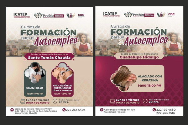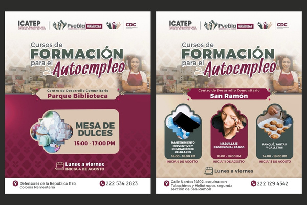 CIUDAD DE PUEBLA.- Como parte del compromiso del presidente municipal Pepe Chedraui de poner orden en la ciudad y generar oportunidades para el desarrollo económico, el Gobierno de la Ciudad invita a la ciudadanía a inscribirse en los cursos gratuitos de capacitación para el autoempleo que se realizarán en distintos Centros de Desarrollo Comunitario (CDC) y el Parque Biblioteca, en coordinación con el Instituto de Capacitación para el Trabajo del Estado de Puebla (ICATEP).
