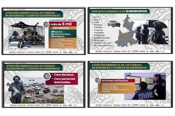 Por otro lado, el secretario de Gobernación de Puebla, Samuel Aguilar Pala, el Vicealmirante de la Secretaría de Seguridad Pública del Estado de Puebla, Francisco Sánchez González, y el presidente municipal, Pepe Chedraui, coincidieron en señalar que Puebla está tranquila y en paz tras el operativo realizado en Jalisco por la Sedena en contra de “El Mencho”.