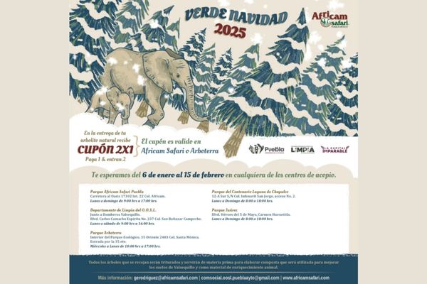 CIUDAD DE PUEBLA.- El parque Africam Safari y el Gobierno de la Ciudad de Puebla, encabezado por el presidente municipal, Pepe Chedraui, pusieron en marcha la Campaña Verde Navidad 2025, a través del Organismo Operador del Servicio de Limpia (OOSL), con el objetivo de fomentar el reciclaje de árboles naturales de Navidad y fortalecer el cuidado del medio ambiente.