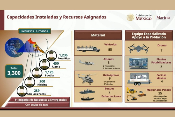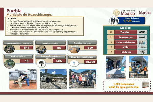 El secretario de la Marina, Raymundo Pedro Morales Ángeles, detalló que se tienen desplegados 3 mil 300 elementos en los estados afectados y en Puebla son mil 125 efectivos, donde se distribuyeron también 13 vehículos, tres embarcaciones, una planta potabilizadora, un avión y un helicóptero. Comentó que se han atendido 541 personas, 640 fueron trasladadas a albergues y se han despejado 13 vías carreteras.