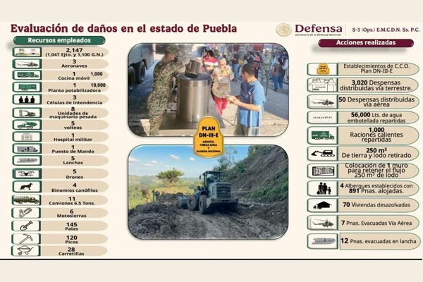 El secretario de la Defensa Nacional, Ricardo Trevilla Trejo, informó que en Puebla se desplegaron 2 mil 147 efectivos, una cocina móvil, una planta potabilizadora, cinco lanchas y un hospital militar. Además explicó que se han distribuido 3 mil 20 despensas, cuatro albergues instalados con 891 personas y se han realizado desazolves en 70 viviendas.