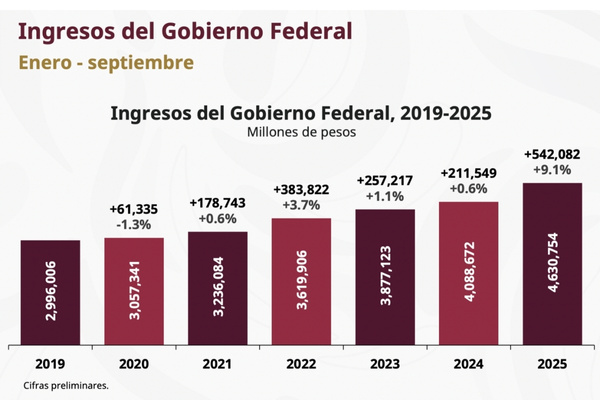 Durante la Mañanera del Puebla, Sheinbaum Pardo explicó que de “En enero-septiembre de 2019, la recaudación llegaba a los 3 billones. Un billón en México, como lo contamos, es un millón de millones, o sea, 12 ceros. Son casi 3 billones. A septiembre de 2025, la recaudación es de 4.6 billones. Obviamente, aquí hay una parte de inflación, pero, de todas maneras, fíjense, de 2024 a 2025 es 9.1 por ciento, es decir, en términos reales, incluso descontando inflación”.