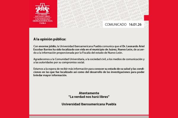 SAN ANDRÉS CHOLULA, PUBLA.- La Universidad Iberoamericana de Puebla informa con enorme júbilo que el doctor Leonardo Ariel Escobar Barrios ha sido localizado con vida en el municipio de Juárez, Nuevo León, Monterrey.