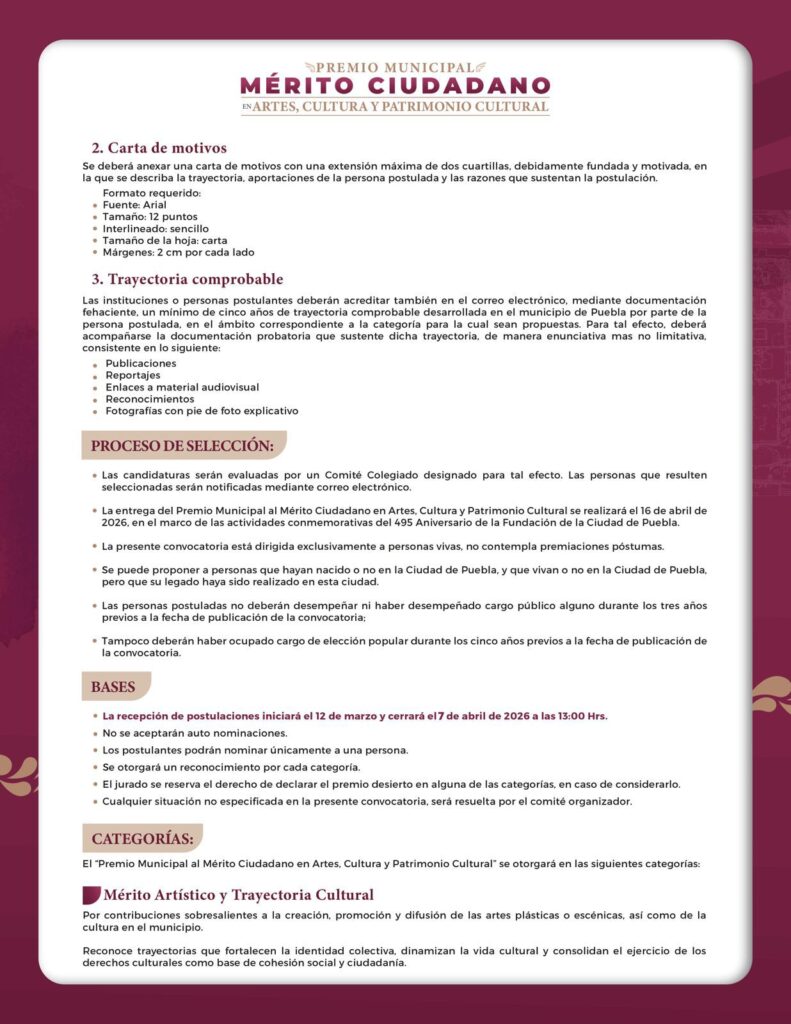 La convocatoria cierra hasta el siete de abril a las 13:00 hrs. La premiación se realizará el 16 de abril de 2026. Las bases completas se pueden consultar en la dirección electrónica: https://centrohistorico.pueblacapital.gob.mx/