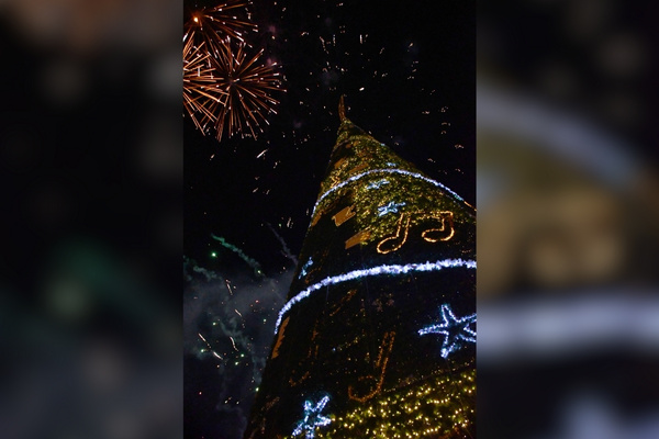 Después de la cuenta regresiva para presionar el botón e iluminar las 90 mil luces led del Árbol de Navidad, de 30 metros de altura, con 7 mil 200 metros cuadrados de escarcha, 186 series de 500 luces cada una y figuras alusivas a las bellas artes, la Rectora Lilia Cedillo Ramírez dio un mensaje de paz y compartió sus mejores deseos para el año venidero.