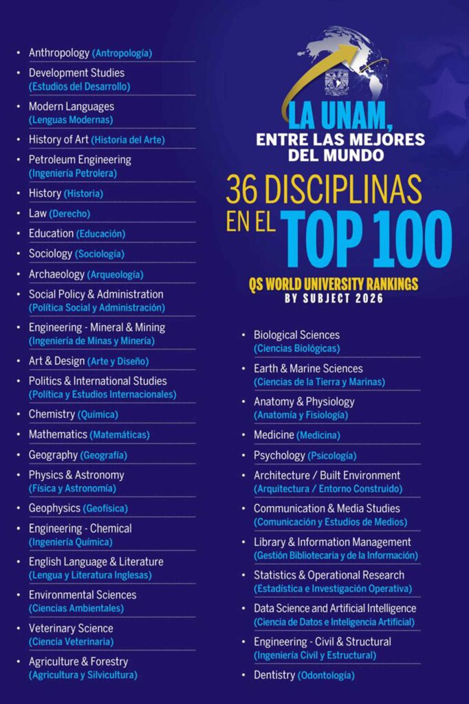 CIUDAD DE MÉXICO.- La Universidad Nacional Autónoma de México (UNAM) ha consolidado su liderazgo académico y su compromiso con la educación pública de calidad, según los resultados del QS World University Rankings by Subject 2026.