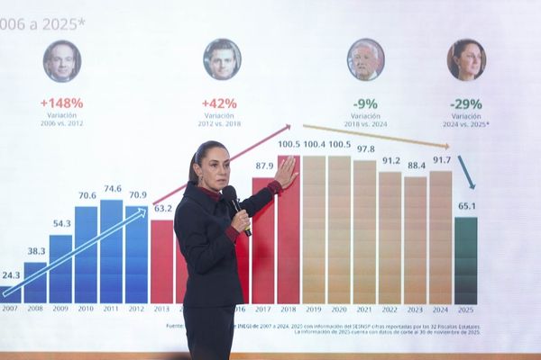 La jefa del Ejecutivo federal señaló que la baja de 37 por ciento en el delito de homicidio doloso es resultado de las acciones del presidente López Obrador y de cambios legales para fortalecer la inteligencia y la investigación para la seguridad pública.