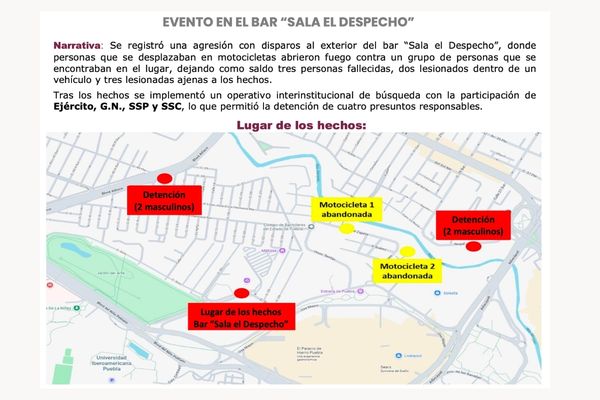 “Nadie va a salir impune; en Puebla vamos a aplicar toda la fuerza de la ley y no vamos a permitir que se atente contra nuestras corporaciones ni contra las familias”, expresó, destacando también el apoyo tecnológico del DGERI y el C5, así como el respaldo del helicóptero del Gobierno del Estado, además de la coordinación con Ejercito y Guardia Nacional, Marina y Fiscalía General del Estado.
