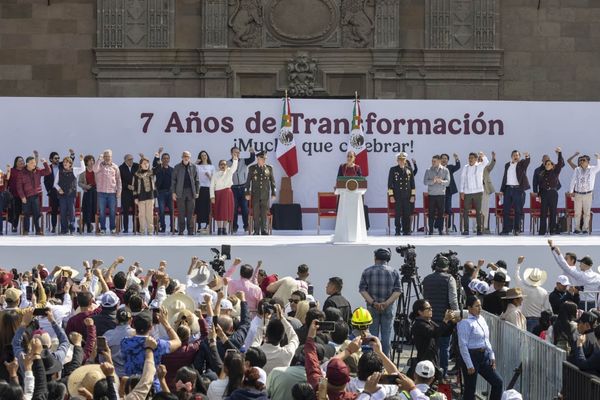 CIUDAD DE MÉXICO.- Ante más de 600 mil mexicanas y mexicanos reunidos en el Zócalo de la Ciudad de México, la Presidenta Claudia Sheinbaum Pardo, celebró los 7 años de la llegada de la Cuarta Transformación y puntualizó que por más campañas sucias y alianzas de grupos del conservadurismo nacional e internacional que buscan intervenciones extranjeras, no podrán vencer al pueblo ni a la Jefa del Ejecutivo Federal, ya que el movimiento representa una ruptura con el viejo régimen y una transformación verdadera, económica, social y moral que se guía por el Humanismo Mexicano.