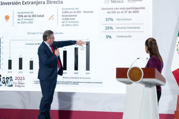 El secretario de Economía, Marcelo Ebrard Casaubon, detalló que el mayor crecimiento en la IED se observa en nuevas inversiones, pasando de 2 mil millones de dólares a 6 mil 500 millones de dólares, que beneficiarán a sectores como energía, centros de datos, obras de infraestructura y sector financiero y cuyo origen en su mayoría proviene de Estados Unidos, España, Países Bajos, Japón y Canadá. Agregó que la IED registra un incremento de 69 por ciento de 2018 a 2025.