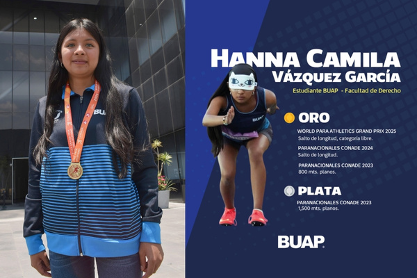 Ella es Hanna Camila Vázquez García, egresada de la Preparatoria Emiliano Zapata, en San Martín Texmelucan y estudiante de la Facultad de Derecho de la BUAP. Su más reciente logro: medalla de oro en salto de longitud, categoría libre, clasificación T11, en el World Para Athletics Grand Prix – 11° Abierto Mexicano de Para Atletismo, que se llevó a cabo en el Polideportivo CODE Revolución, en Jalisco, del 9 al 12 de mayo pasado, donde logró una marca de 3.61 metros, que superó a la del paranacional de la CONADE (Comisión Nacional de Cultura Física y Deporte) -octubre 2024, en Oaxaca-, donde también ganó el oro con un salto de 3.44 metros, en la categoría Juvenil Mayor Superior.