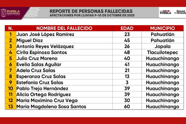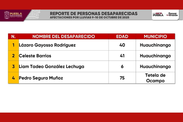 En el municipio de Pahuatlán, las víctimas fueron Juan José López Ramírez y Miguel Díaz. Asimismo, se reportó el fallecimiento de Antonio Reyes en Jopala y Cirila Espinoza Santos en Tlacuilotepec. Por otra parte, también en Huauchinango continúan las labores de búsqueda de Lázaro Gayosso Rodríguez, Celeste Barrios y el menor Liam Tadeo González Lechuga.