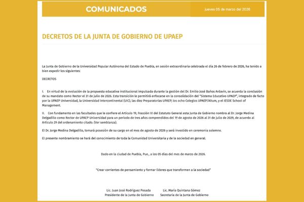 Ante este cambio, la Junta de Gobierno tomó la decisión de designaar al Dr. Jorge Medina Delgadillo como nuevo Rector de UPAEP Universidad, a partir del 1º de agosto de 2026 y hasta el 31 de julio de 2029.