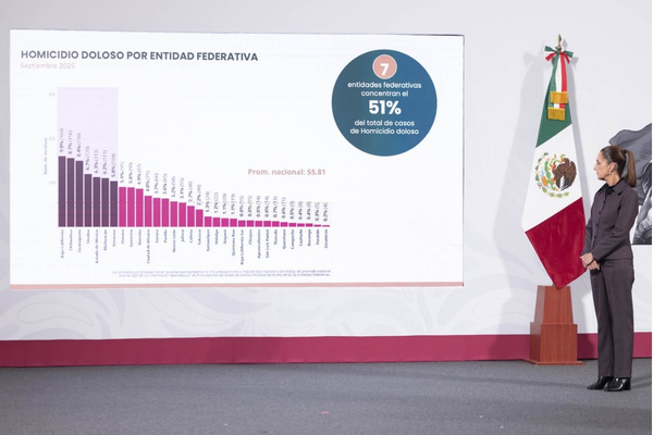 Con cifras actualizadas al 30 de septiembre, los homicidios en México cayeron 32 por ciento en comparación con el mismo mes de 2024. La administración inició con 86.9 homicidios diarios y actualmente se ubica en 59.5; se trata de 27 de estos delitos menos cada día.