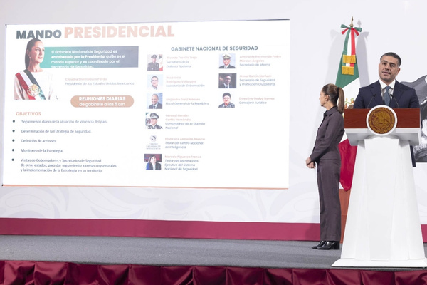 Acompañaron a la presidenta Sheinbaum: la secretaria de Gobernación, Rosa Icela Rodríguez Velázquez; así como los secretarios de Seguridad y Protección Ciudadana, Omar García Harfuch; Defensa Nacional, Ricardo Trevilla Trejo; Marina, Raymundo Pedro Morales Ángeles.