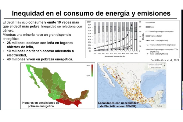 Al referirse a la relación con la inequidad en el consumo y emisiones contaminantes, dijo que el decil (método cuantitativo) de la población de mayores recursos gasta y emite 10 veces más que la más pobre. “Mientras una minoría hace un gran dispendio energético, 28 millones cocinan con leña, 10 millones no tienen acceso adecuado a electricidad y 40 millones viven pobreza energética”.