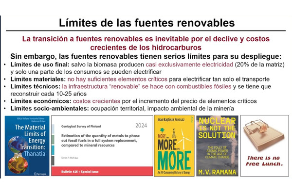 Sin embargo, las fuentes renovables tienen serias fronteras para su despliegue, por ejemplo técnicos, ya que su infraestructura se elabora con combustibles fósiles y se tiene que reconstruir cada 10 a 25 años. Además de que, salvo la biomasa, producen casi exclusivamente electricidad, que representa solo 20 por ciento de la energía que consumismos.