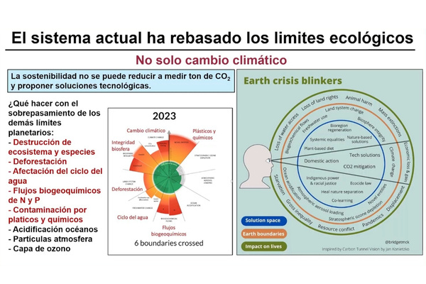 Luca Ferrari recordó que se han rebasado los nueve límites ecológicos, el cambio climático es solo uno. Se trata de umbrales por encima de los cuales la Tierra se vuelve inhabitable; incluyen, entre otros, la extinción masiva de especies, deforestación y contaminación por plásticos, microplásticos y químicos.