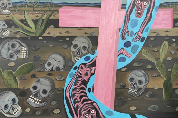 Ideada inicialmente como un tributo a los fallecidos por la pandemia, esta monumental pieza de óleo sobre tela de 3.10 metros de alto por 11 metros de largo, fue ampliando su significado hasta integrarse a la narrativa contemporánea, en la que se acumulan víctimas no sólo del virus, sino también de violencias anónimas que forman parte de este altar simbólico de cráneos sacrificados. En este sentido, la inauguración del mural adquiere un valor histórico al coincidir con el décimo aniversario del descubrimiento de aquel vestigio arqueológico, pero también por responder a los reclamos sociales de verdad y justicia que en la actualidad enarbolan los colectivos de víctimas, madres buscadoras y defensores de los derechos humanos.