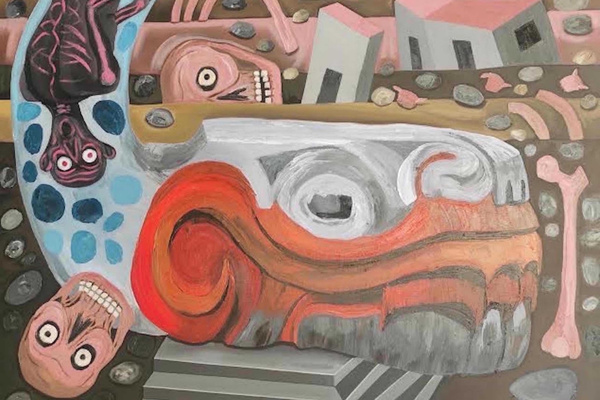 Gustavo Monroy retoma la referencia visual del “Huey Tzompantli”, resaltando la brutalidad y solemnidad de la muerte para transmitir la idea de un sacrificio colectivo y evocar el rol de los mexicas como guerreros al servicio de sus dioses. Mediante una composición que estratifica paisajes y capas temporales, el mural vincula el pasado prehispánico con la actualidad, recreando un territorio mexicano marcado por los restos simbólicos de quienes han fallecido a causa de diversos conflictos sociales.