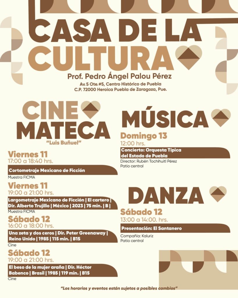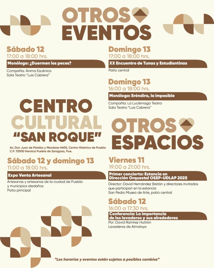 Otros recintos que albergarán actividades programadas por la dependencia son Los Lavaderos de Almoloya, donde se realizará la conferencia “La importancia de los lavaderos y sus alrededores” a cargo de David Ramírez Huitrón, el día 12 a las 16:00 horas y el Centro Cultural “San Roque”, que albergará una expo venta artesanal el sábado y domingo, de 11:00 a 18:00 horas. Los detalles están disponibles en la página sc.puebla.gob.mx.